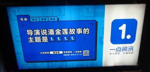 然后就是一點(diǎn)資訊等相繼也開(kāi)始利用戶外廣告機(jī)開(kāi)啟刷街模式,一點(diǎn)資訊的廣告就比較體現(xiàn)互動(dòng)現(xiàn)一點(diǎn)了,主要依靠提問(wèn)來(lái)讓接觸人群與戶外廣告機(jī)互動(dòng),從而達(dá)到傳播品牌效果,其中就有一個(gè)“我不是潘金蓮的主題是_________”后面就是填空了,我想看過(guò)的都會(huì)停下來(lái)手動(dòng)填寫(xiě)吧!